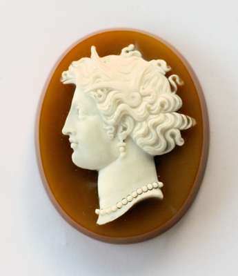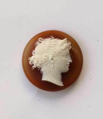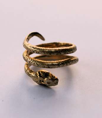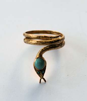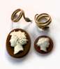 modelled as coiled snakes, one with a turquoise set to the head; two oval carved hardstone cameos (un-mounted)