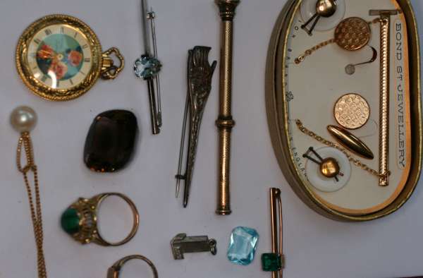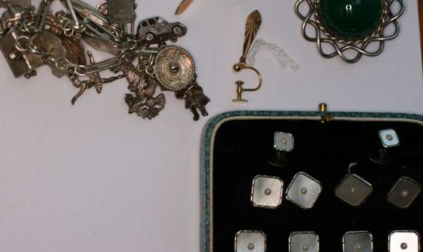 gold cased wrist watch; swivel fob; garnet set floral brooch; citrine set brooch; cased set of MOP and pearl set dress studs; two gold and gem set dress rings; signet ring; silver pin; cased cultured pearl by Mikimoto; a silver charm bracelet; paste pearls; pearl set pendant and chain; pearl; set dress ring, two gold gem set bar brooches etc.
