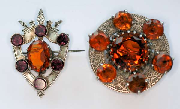 comprising a kilt pin; horse shoe brooch; shield shaped brooch set citrine; two circular brooches and an oval moss type agate brooch ((6)