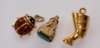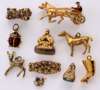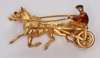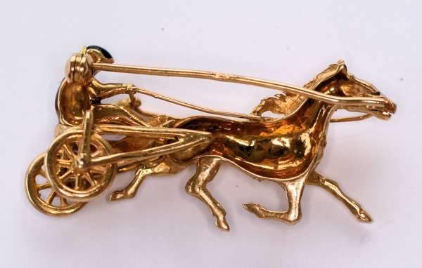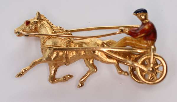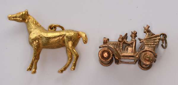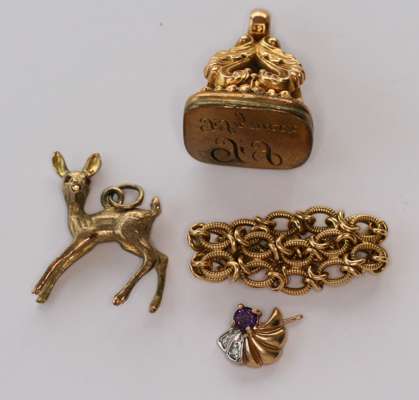 a chain link ring; two seals; three charms; a deer charm; a gold stallion pendant; an unmarked enamelled brooch modelled as a horse and trotting cart with jockey