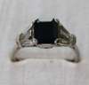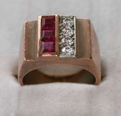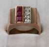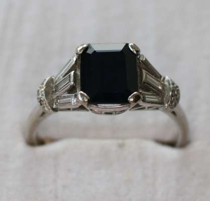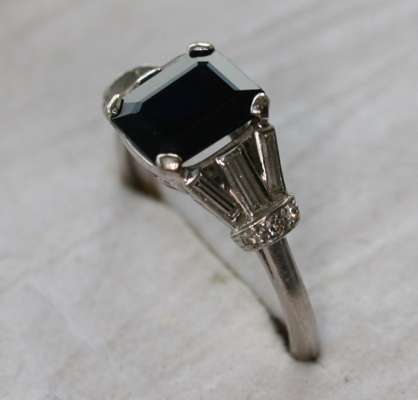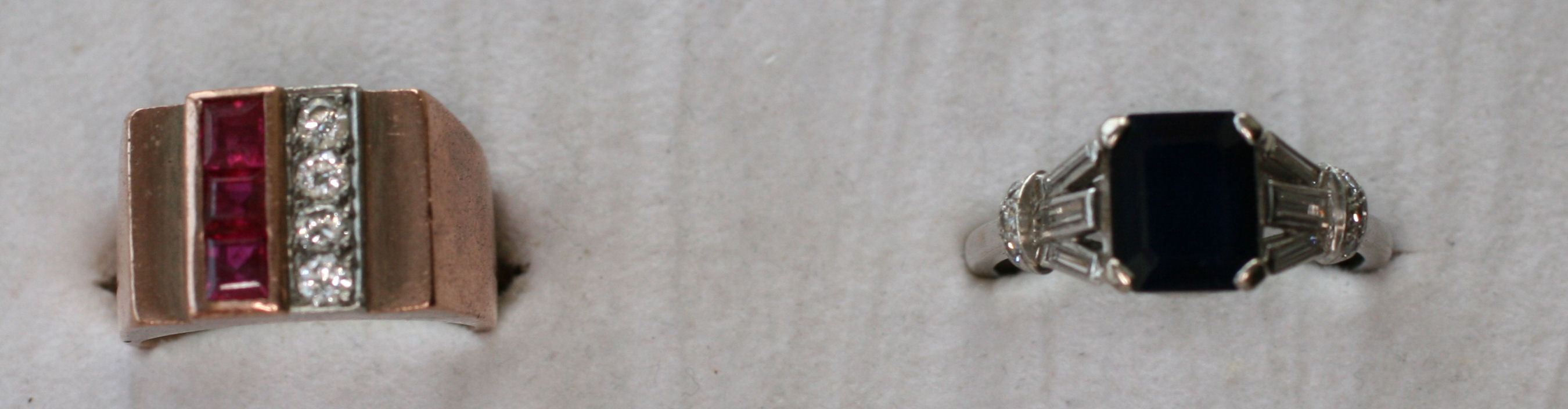 the central rectangular cut sapphire with simple baguette cut diamonds to the shoulders, all set in platinum, together with an Art Deco ruby and diamond ring calibre cut set rubies and four circular cut diamonds (2)