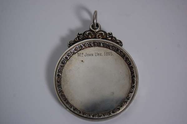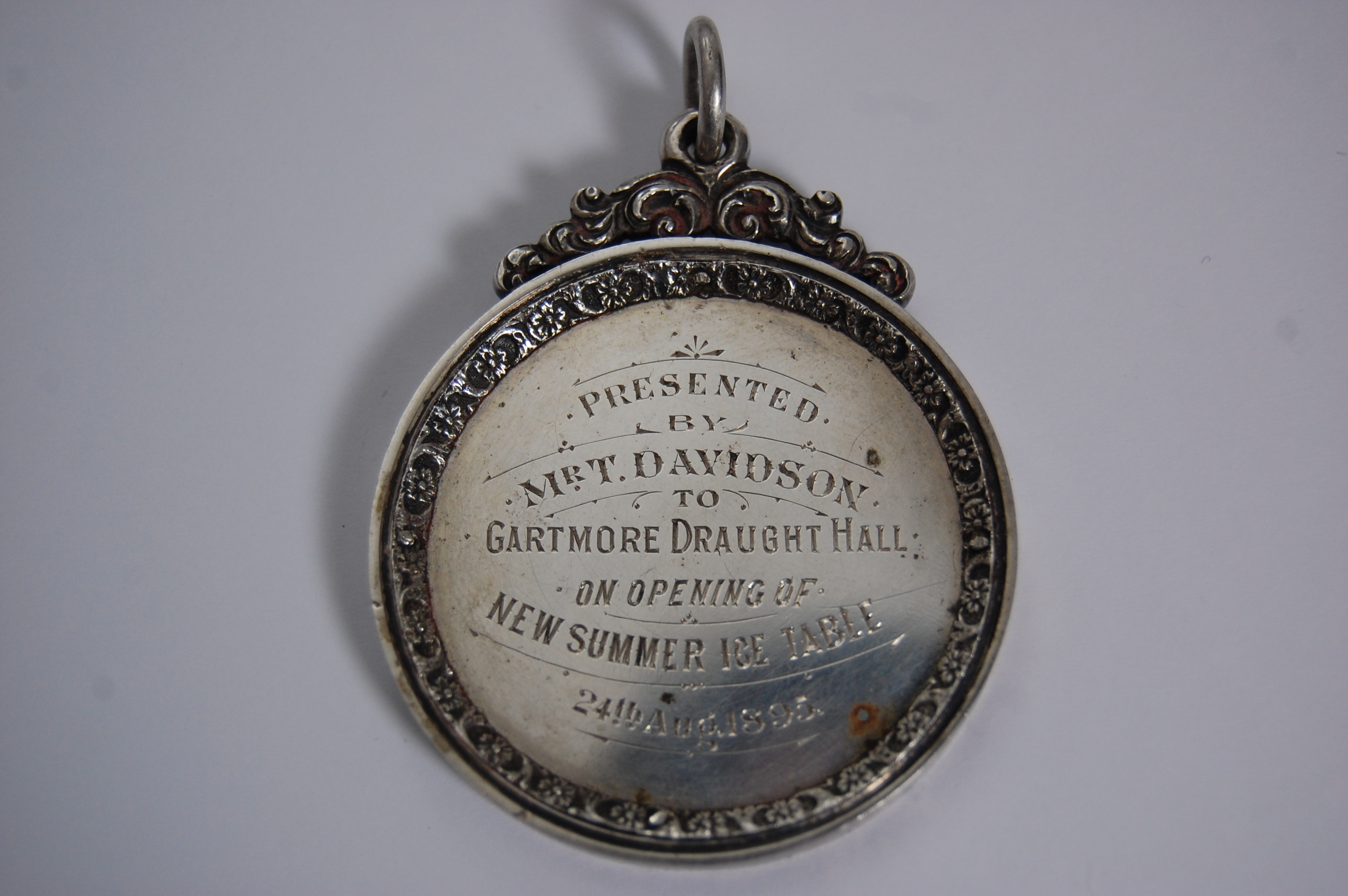 unmarked, of circular outline with inner foliate border and scroll suspension, the obverse engraved 'Presented by Mr T Davidson to Gartmore Draught Hall on opening of New Summer Ice Table 24th August 1895' the reverse inscribed with winner's name 'Mr John Ure 1895'
