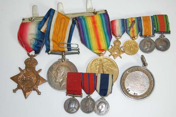 awarded to 1120 CPL.D.MOODIE. R.SCOTS (the War and Victory medals to 2.LIEUT D MOODIE) with miniature medal group; together with a miniature group comprising 1903 Scottish Police Medal, 1911 Scottish Police medals and Long Service medal and other sundry coins and token (qty)