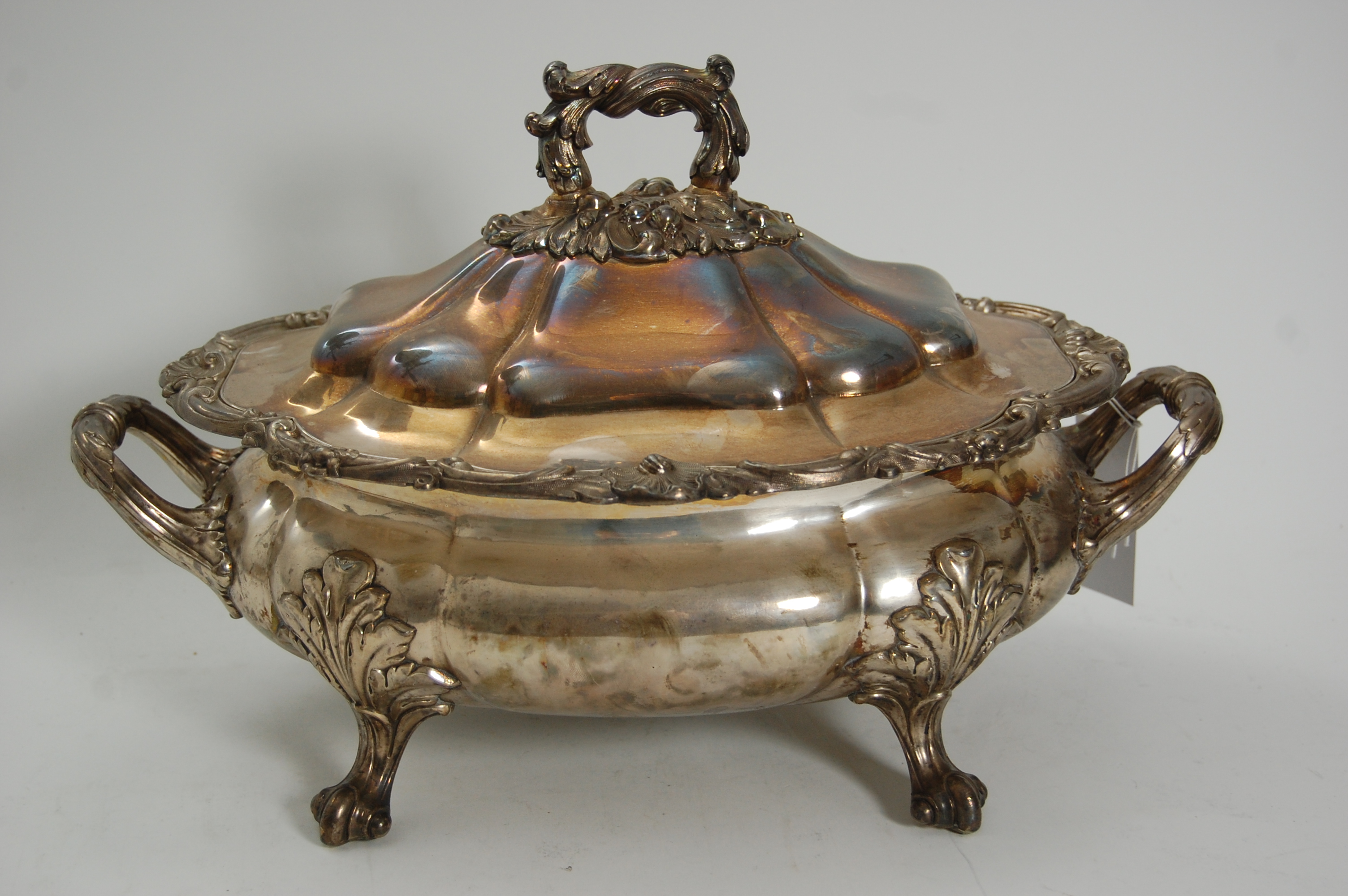 of shaped oval outline with shell and foliate border, the venison dish resting on a simple straight sided bain marie with four bracket feet and twin loop handles; together with a silver plated soup tureen and cover, of lobed oval outline with shell and foliate border with twin handles and raised on bracket feet, the domed cover with naturalistic loop handle (2)
