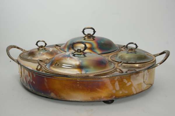 of shaped oval outline with reeded and shell border; together with a silver plated serving dish, of large oval outline with twin loop handles, set with four smaller oval serving dishes within, each with simple pull off domed cover and loop handles (3)
