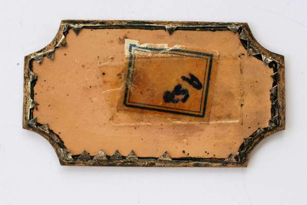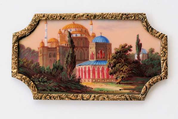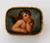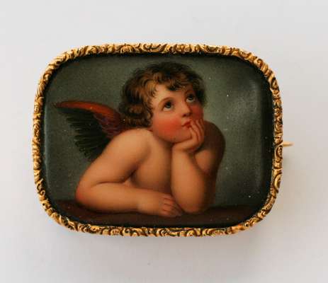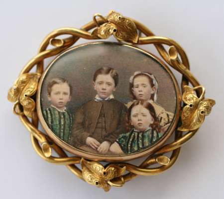 in chased gold frame of an Eastern temple (un-mounted); a gold mounted brooch with a winged putto enamel panel; a framed hand coloured oval photographic portrait of four children, engraved inscription to the rear
