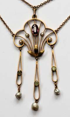 modelled as a vase of flowers with pearl set spray of flowers; with a gold peridot, pearl and amethyst scrolling necklace