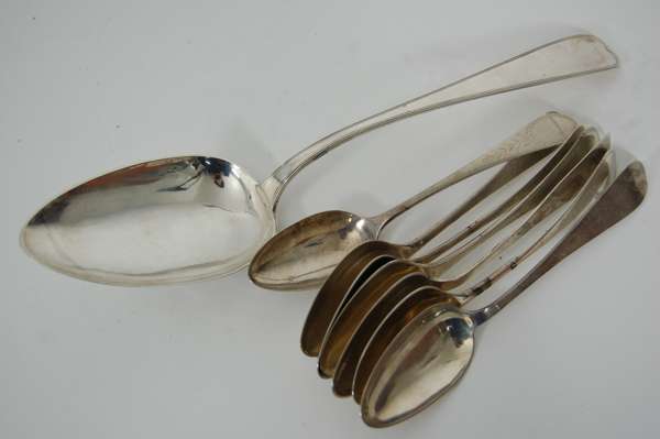to include a large serving spoon of Old English and thread variant and a group of seven Celtic point tablespoons with prick engraved presentations and dates (8)