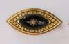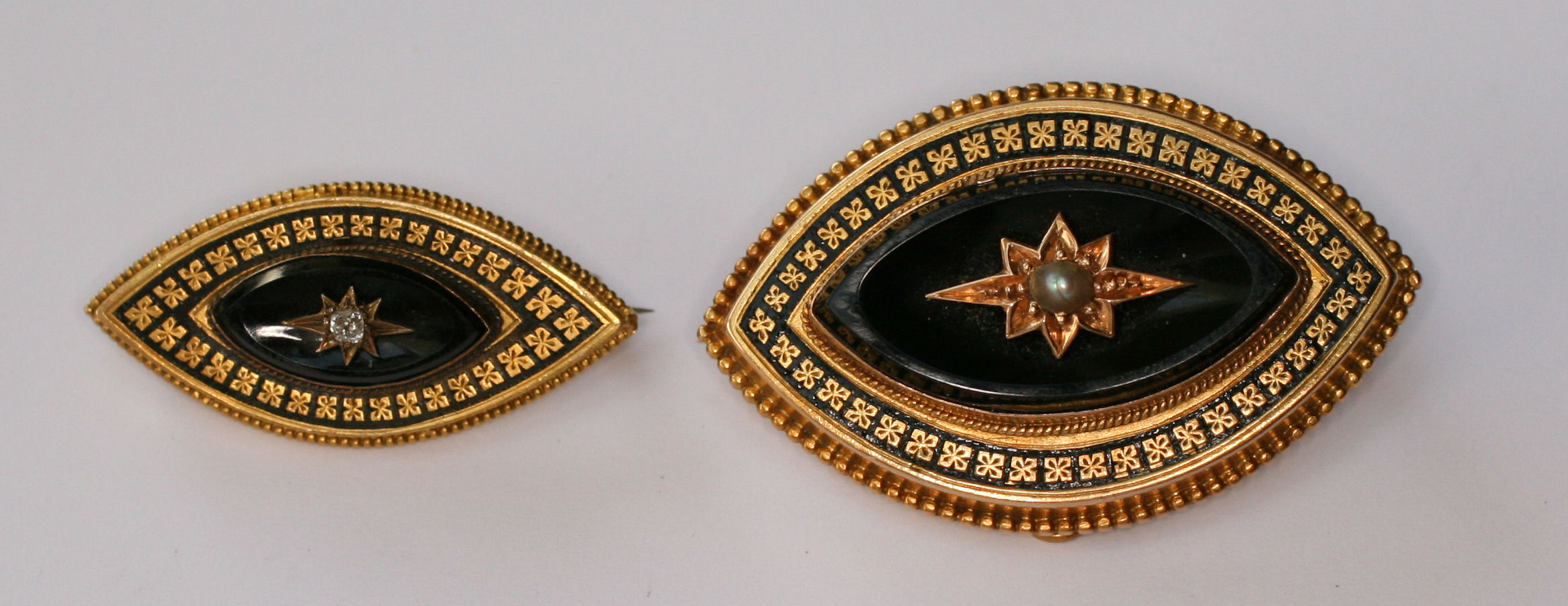 both of navette shape, the larger with enamelled border, onyx ground set with a pearl in a star setting, the other similar and set with a small diamond (2)