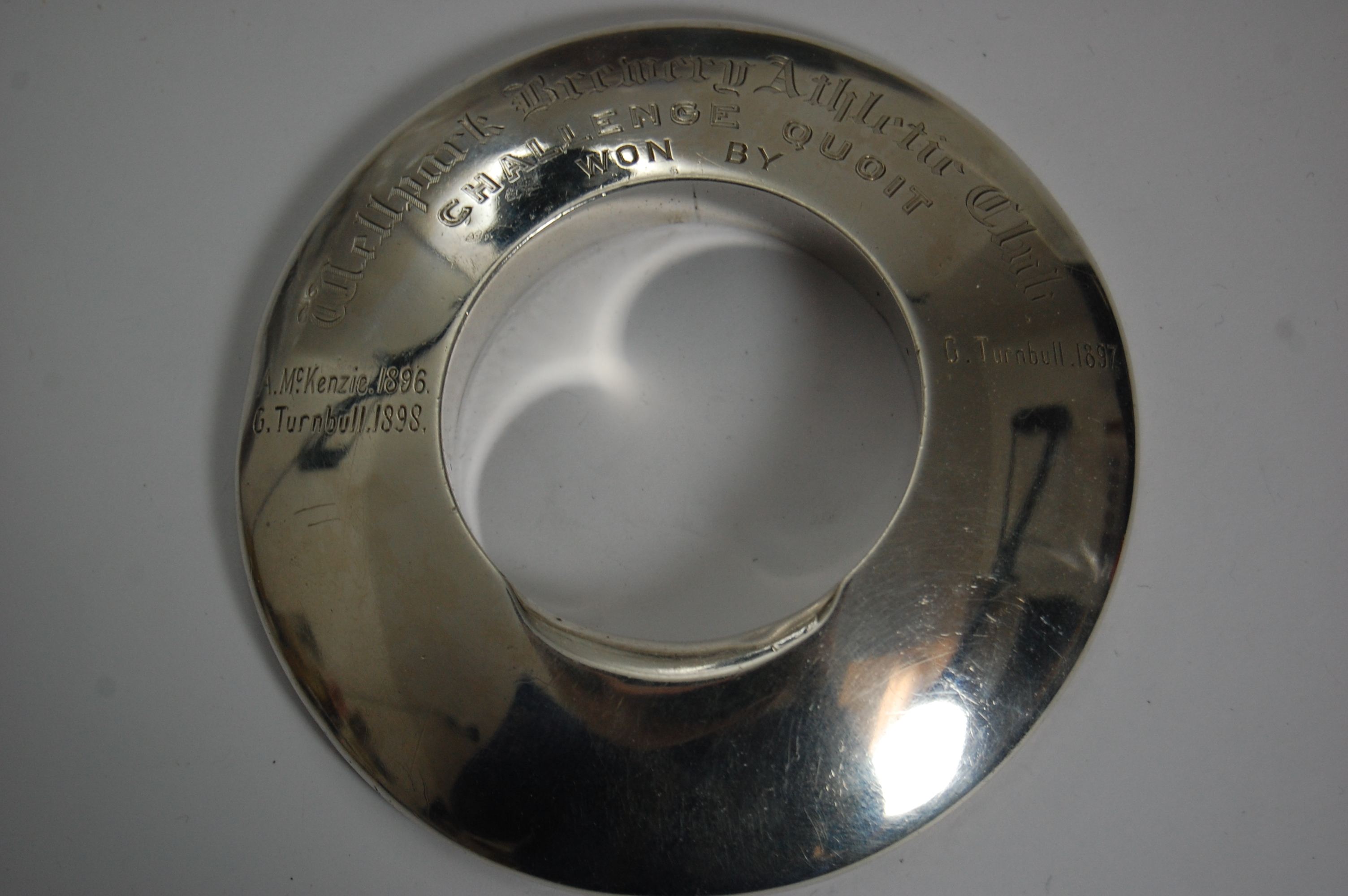 Thomas Ross & Sons, Glasgow 1895, traditionally formed with a presentation inscription to obverse ' Wellpark Brewery Athletic Club challenge quoit won by...' with three presentation inscriptions