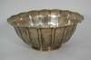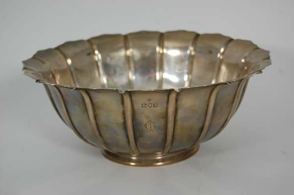 London 1910, of fluted hemispherical form with everted lobed border, the body with engraved monogram, raised on a simple collet foot