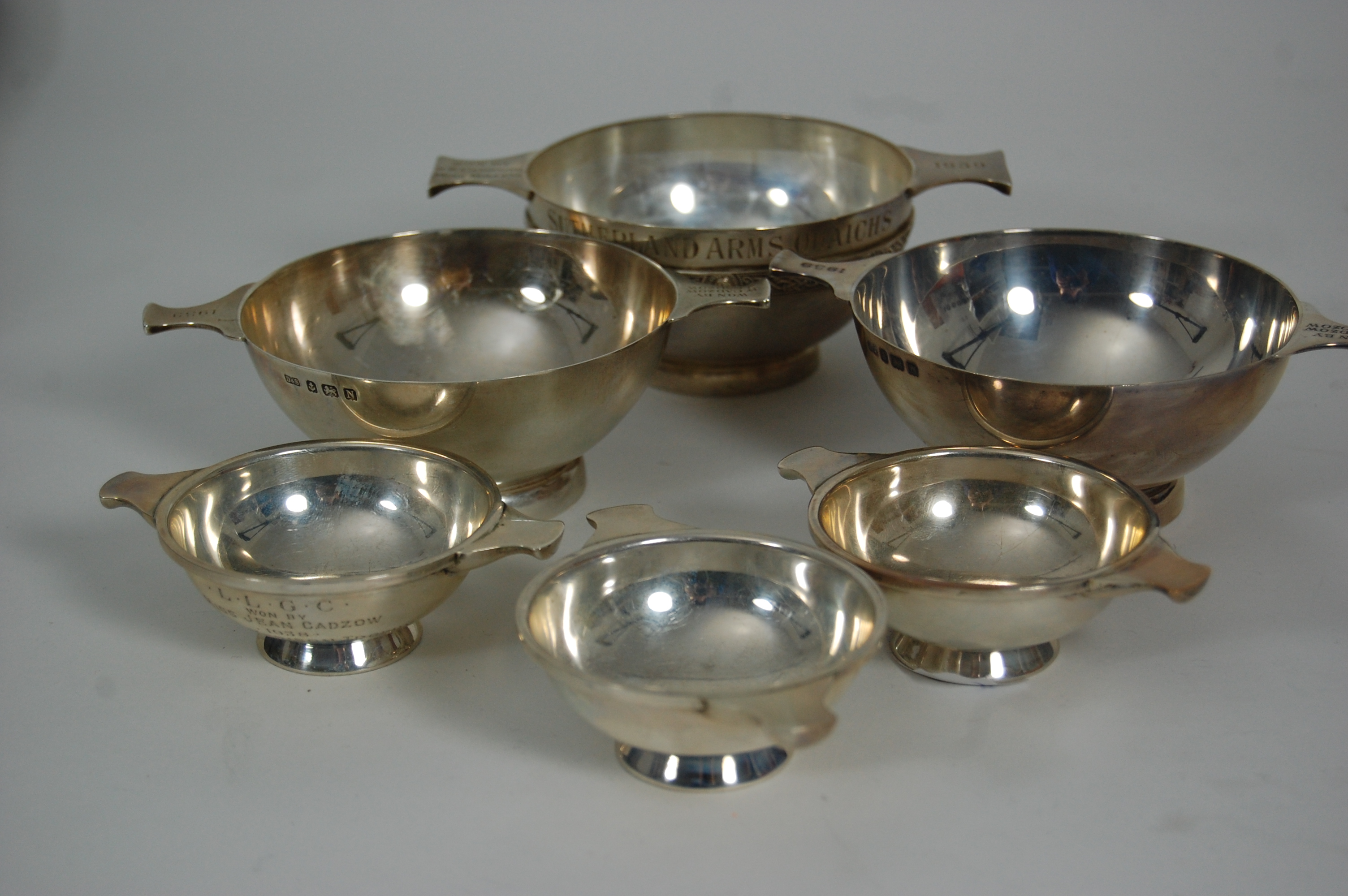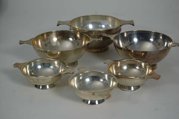 various dates and makers, of typical form with twin lugs and collar foot, some with engraved inscriptions and applied Celtic band work (6)