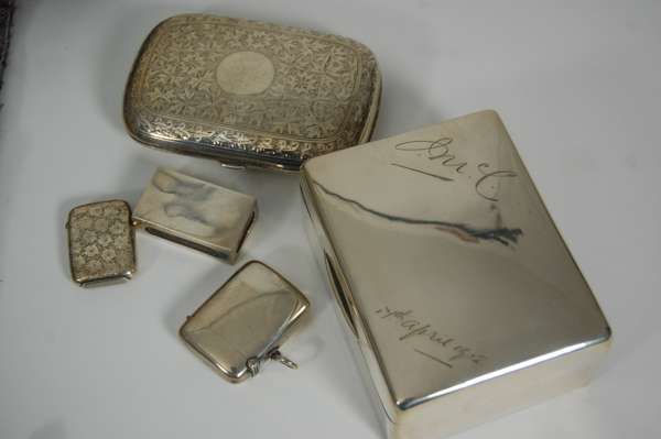 to include five engraved vesta cases of typical form, two cigarette cases and two cigarette boxes (9)