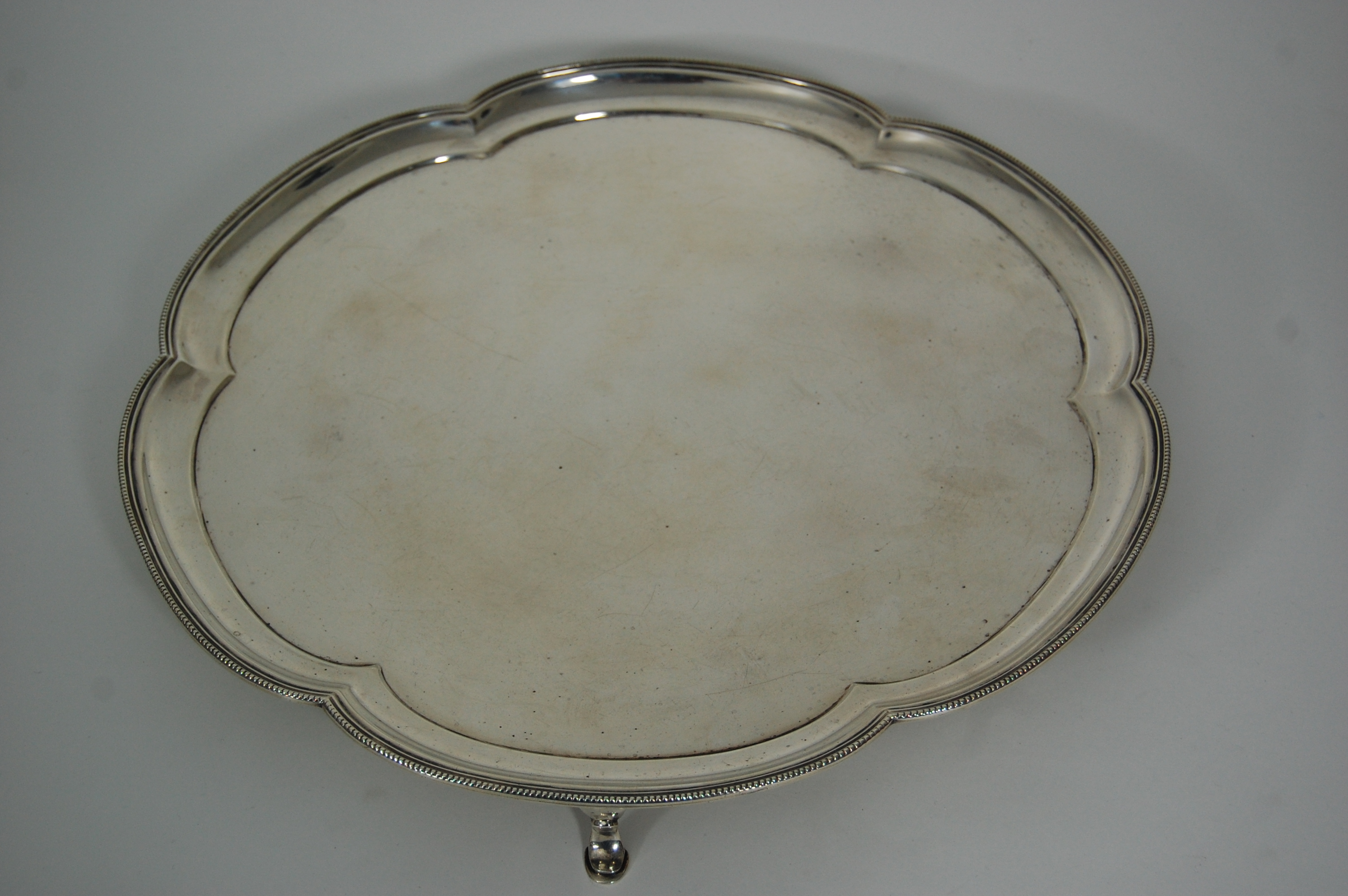 Edwards & Sons (of Glasgow), Sheffield 1939, of lobed circular outline with beaded rim and raise on three hoof feet
