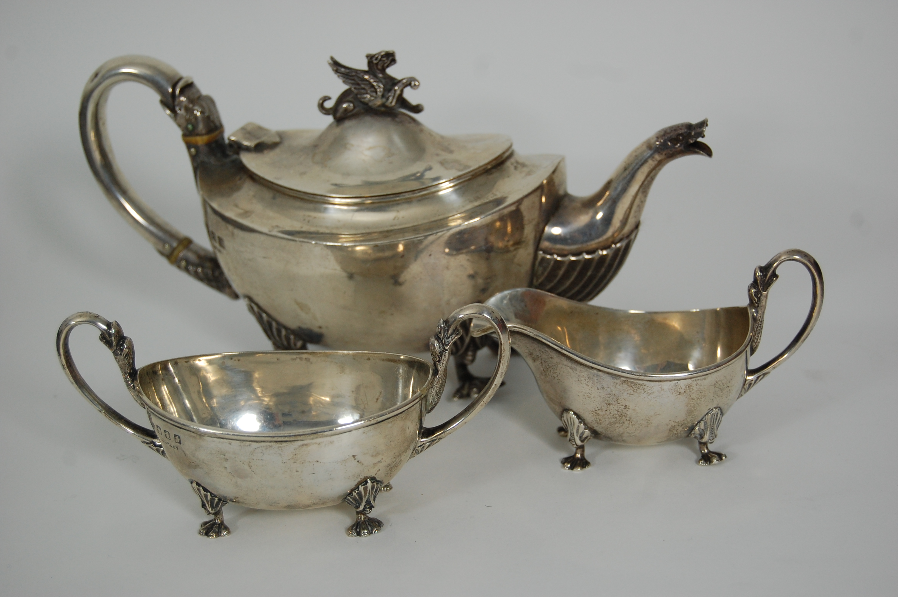 R & W Sorley, Glasgow 1912, comprising teapot, twin handled sugar bowl and milk jug, each with plain tapered body with acanthus and claw feet, with curved spouts with figural terminals (3)