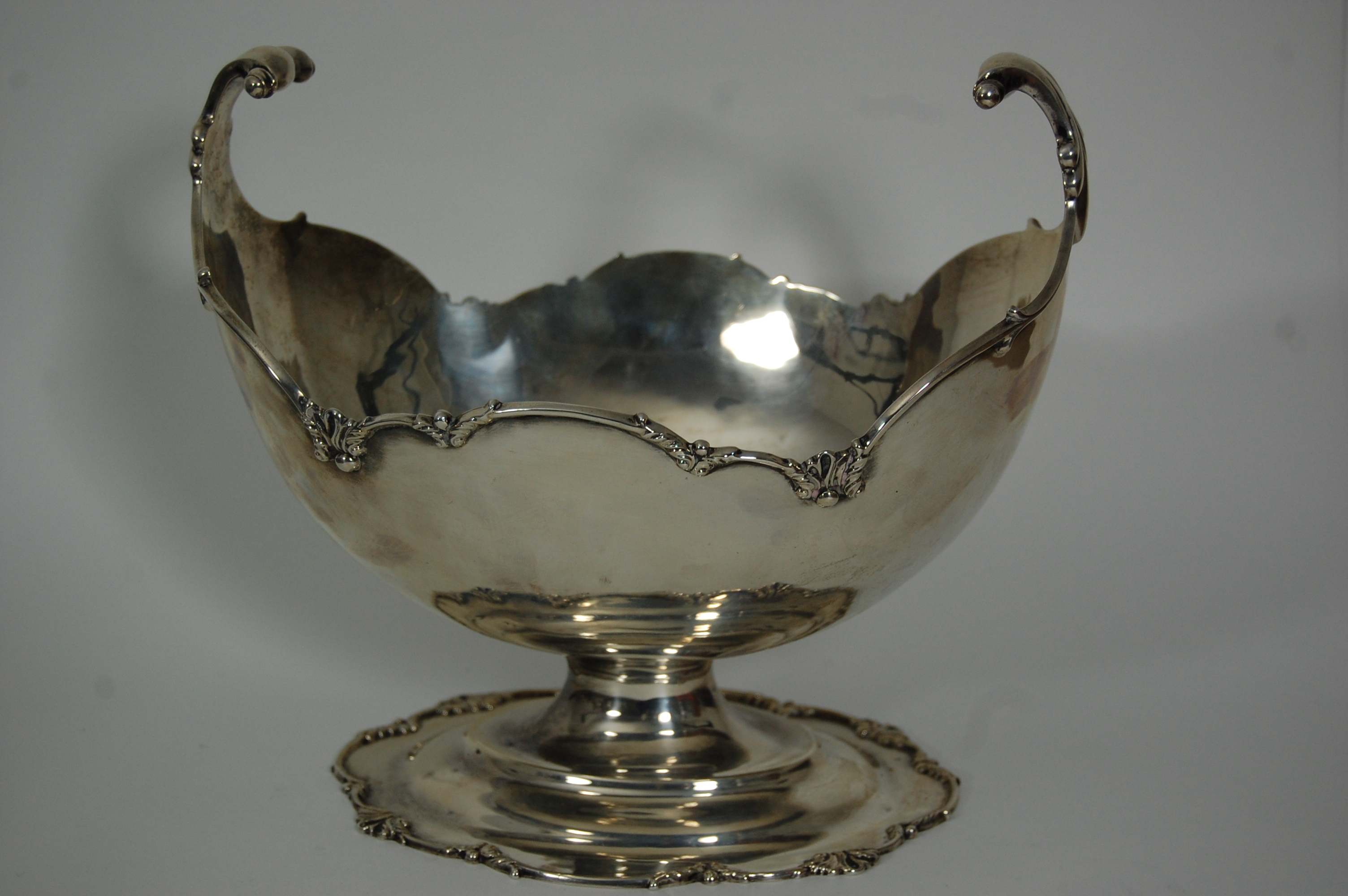 London 1911, of oval outline with twin scrolled handles with floral details to moulded rim,. raised on a spreading oval foot