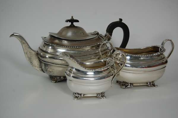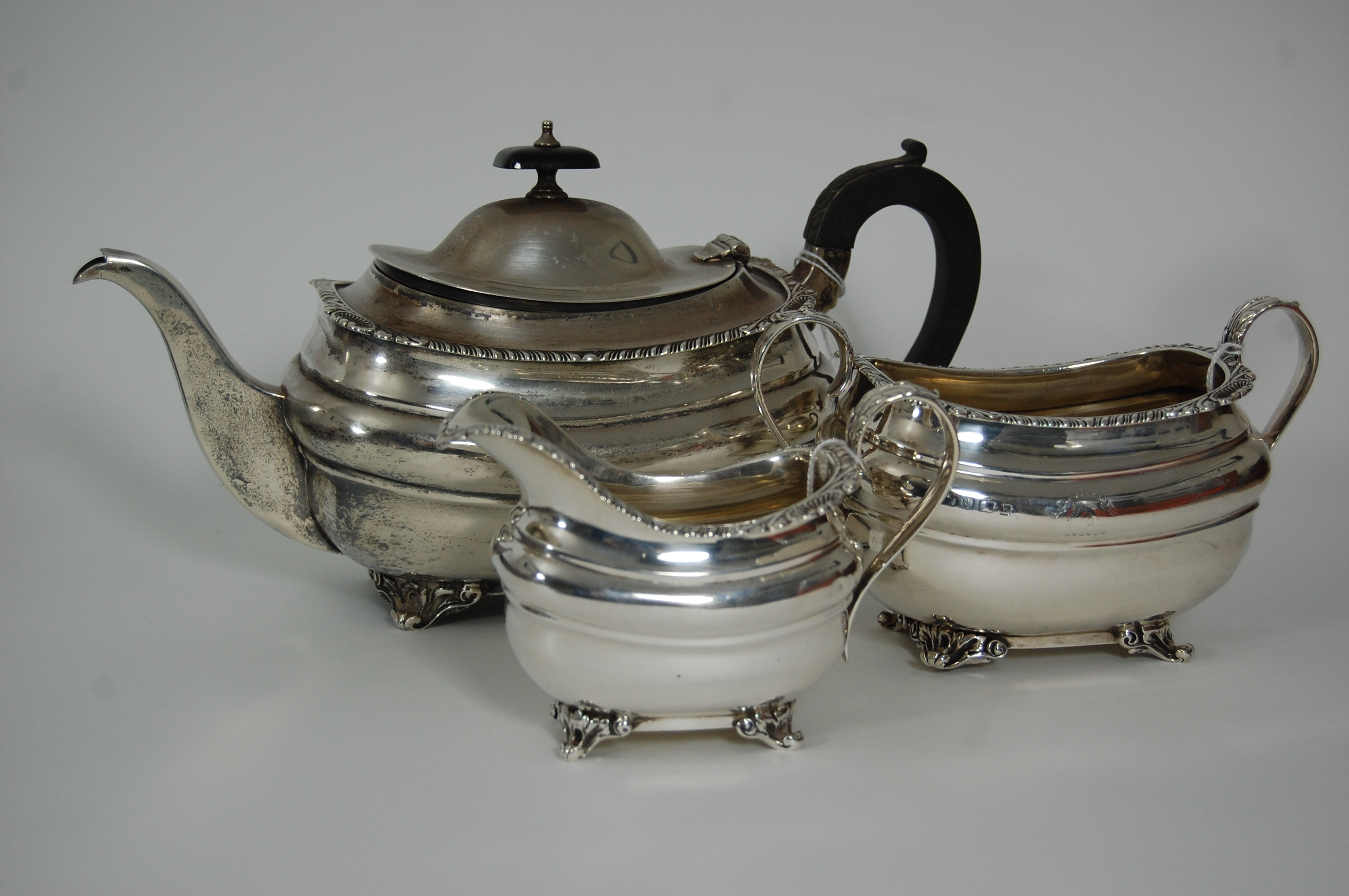 Elkington & Co, Birmingham 1907, comprising teapot, twin handled sugar bowl and milk jug, the simple baluster bodies with everted gadrooned rim, with acanthus capped S scroll handles (3)
