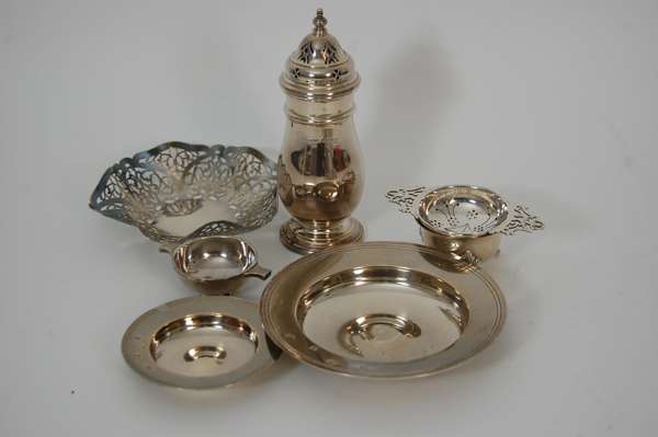 to include a tea strainer and stand, two modern armada dishes, a sugar caster, a pair fo small spill vases etc (qty)