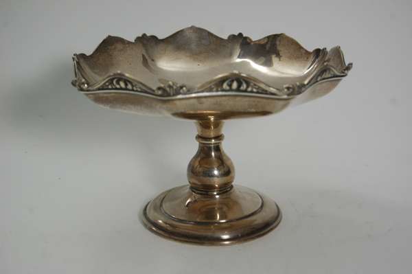 Birmingham 1910, makers mark worn, the shallow panelled dish with scalloped rim, raised on a a baluster stem and domed foot