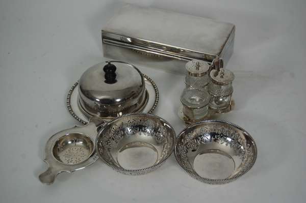 London 1916, of simple rectangular form with domed hinged cover; together with a small collection of items to include a covered butter dish, cruet stand, tea strainer and pierced dishes (qty)