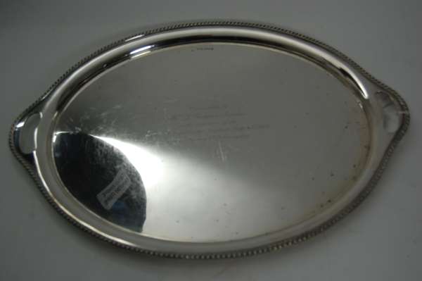 Walker & Hall, Sheffield 1934, of oval outline with gadrooned rim with twin integral loop handles, the centre with presentation inscription
