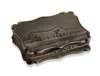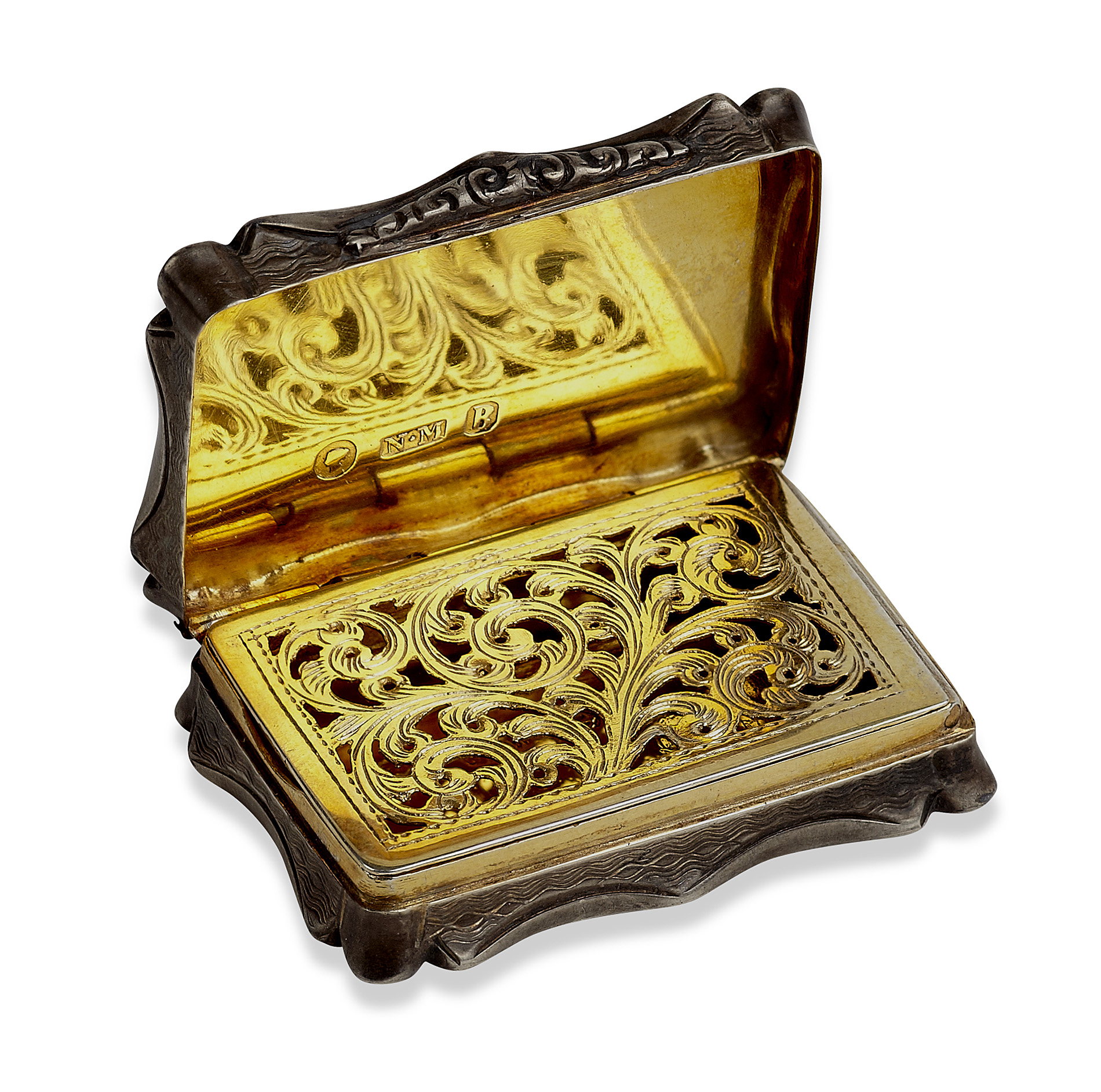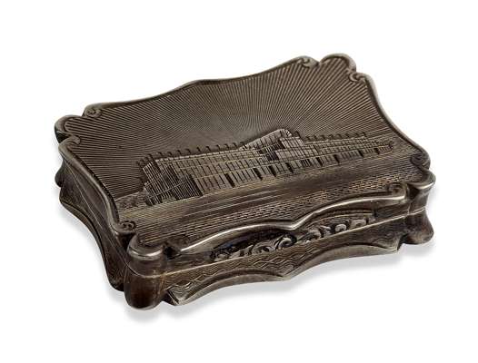Nathaniel Mills, Birmingham 1850, of shaped rectangular outline with engraved scene of Crystal Palace, the base with engine decoration and vacant scroll formed cartouche, the gilt interior with hinged pieced foliate grill