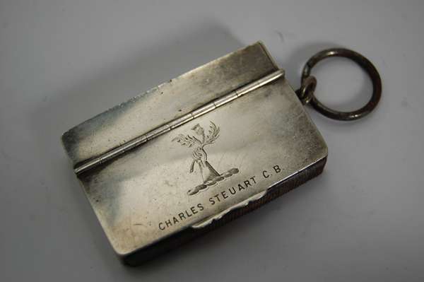Brook & Sons, Edinburgh 1869, with twin hinged compartments and steel striker; together with a Victorian cased spoon and fork and a 'seal top' pickle fork