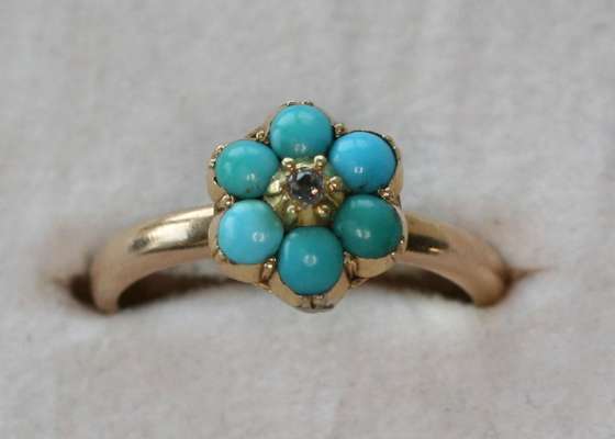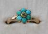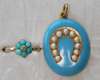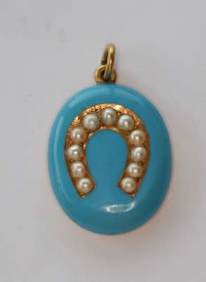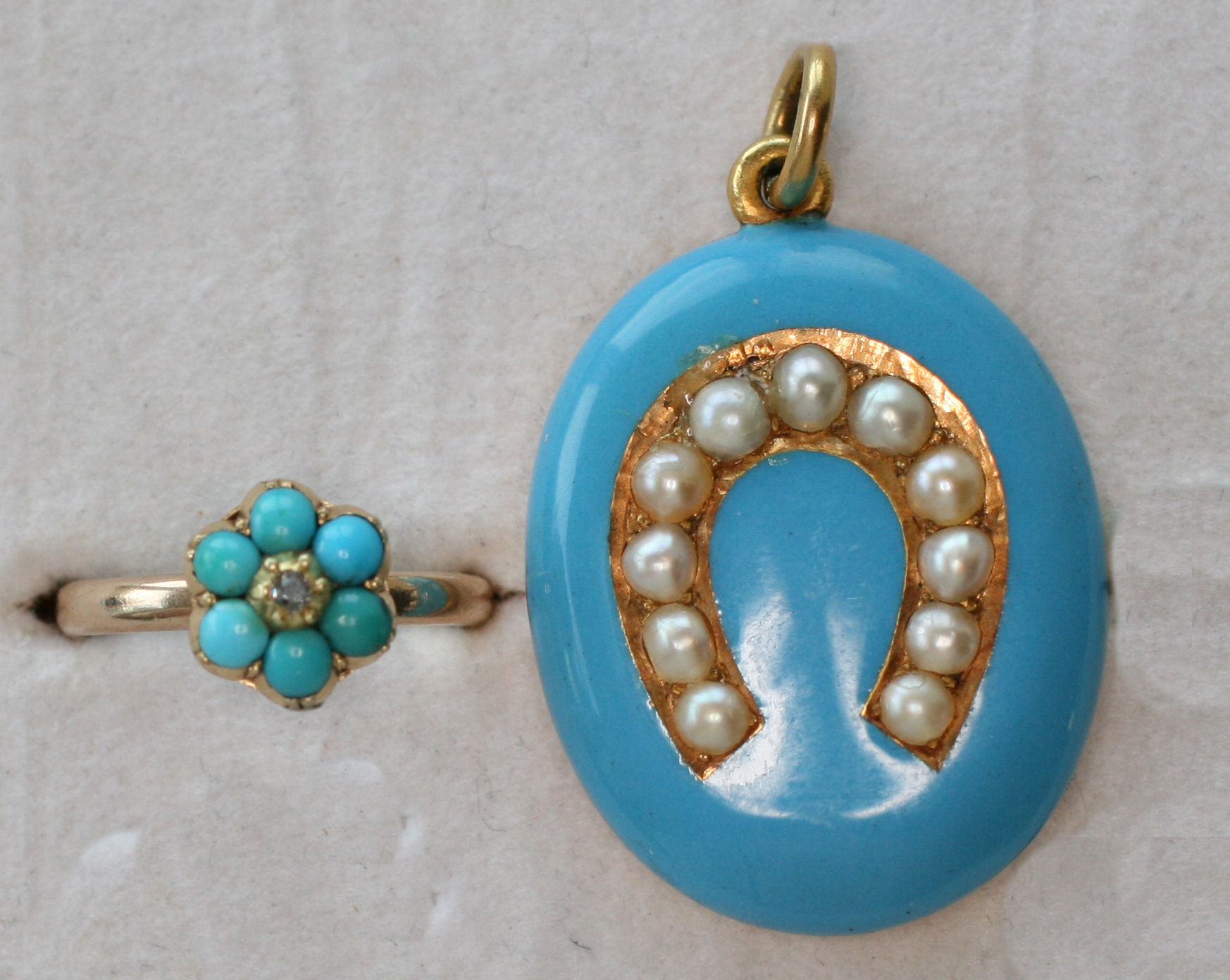central flower head cluster on a plain band, together with a Victorian gold, enamel and pearl set pendant, the turquoise enamel ground with inset half pearl set horse shoe motif, glazed compartment to rear (2)