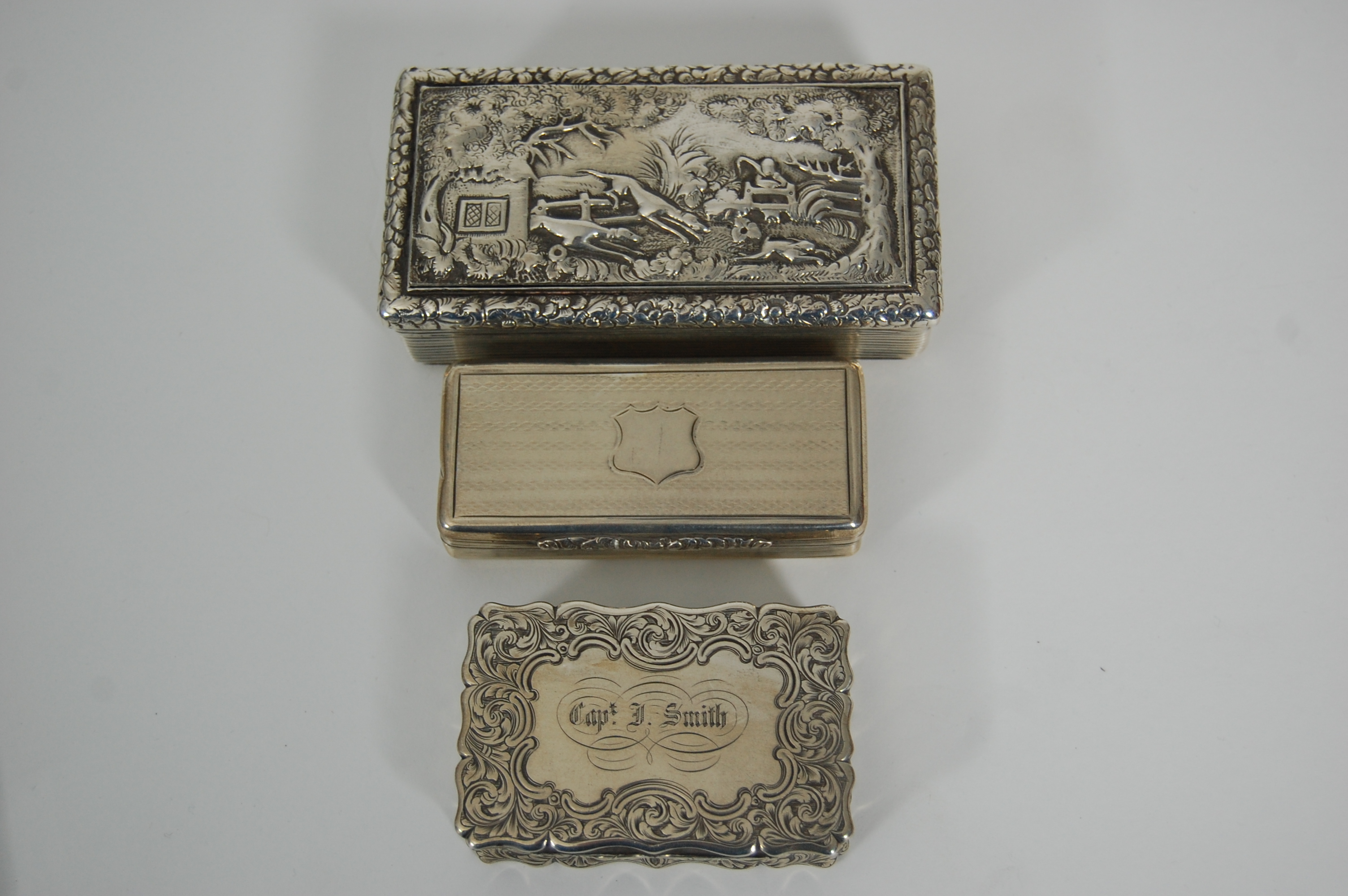 to include, a Birmingham 1829, with cast scene of hounds chasing a hare; together with two smaller examples with engraved decorations (3)