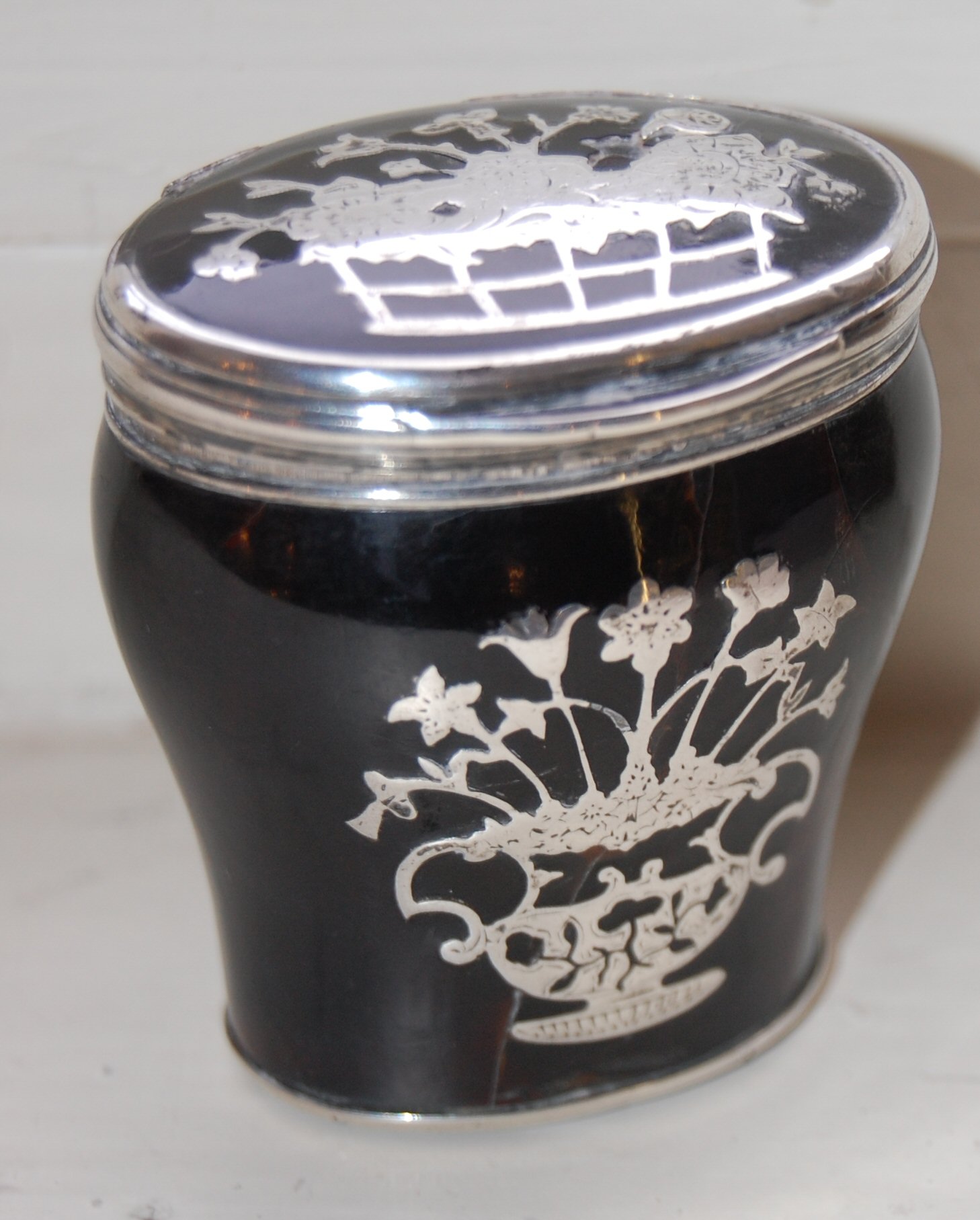 the tortoiseshell body inlaid to obverse and reverse with urn of flowers, the hinged tortoiseshell cover with reeded rim and inlaid with basket of flowers