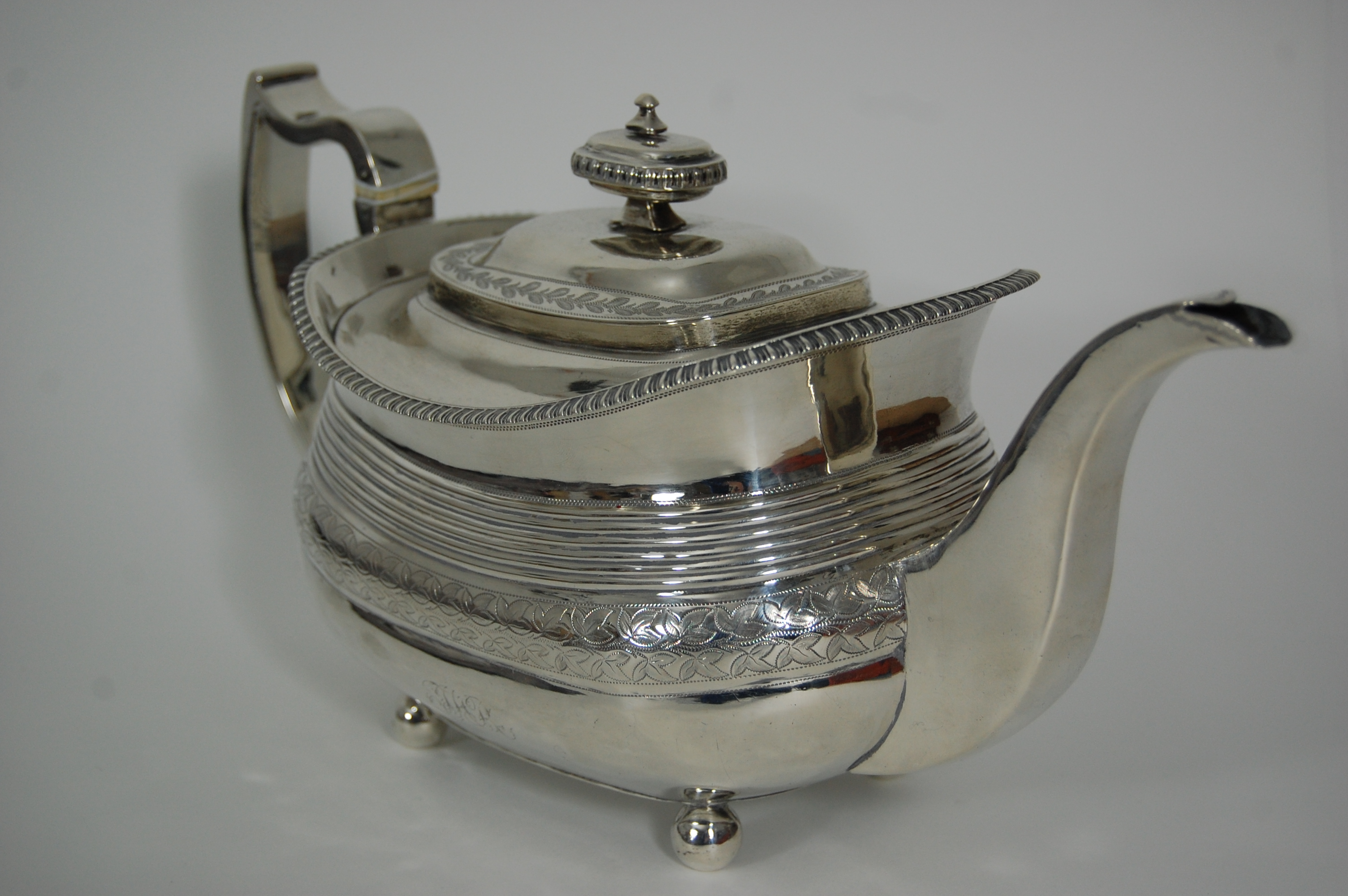 London1812, the baluster body with reeded border and engraved decoration, with curved spout and C scroll handle