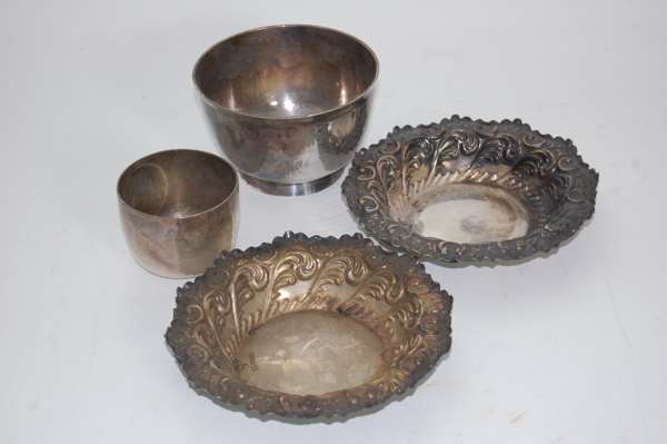 London 1818, of oval outline with integral loop handles and reeded decoration; together with a pair of embossed bon bon dishes, a sugar bowl, vesta case and tumbler cup (qty)