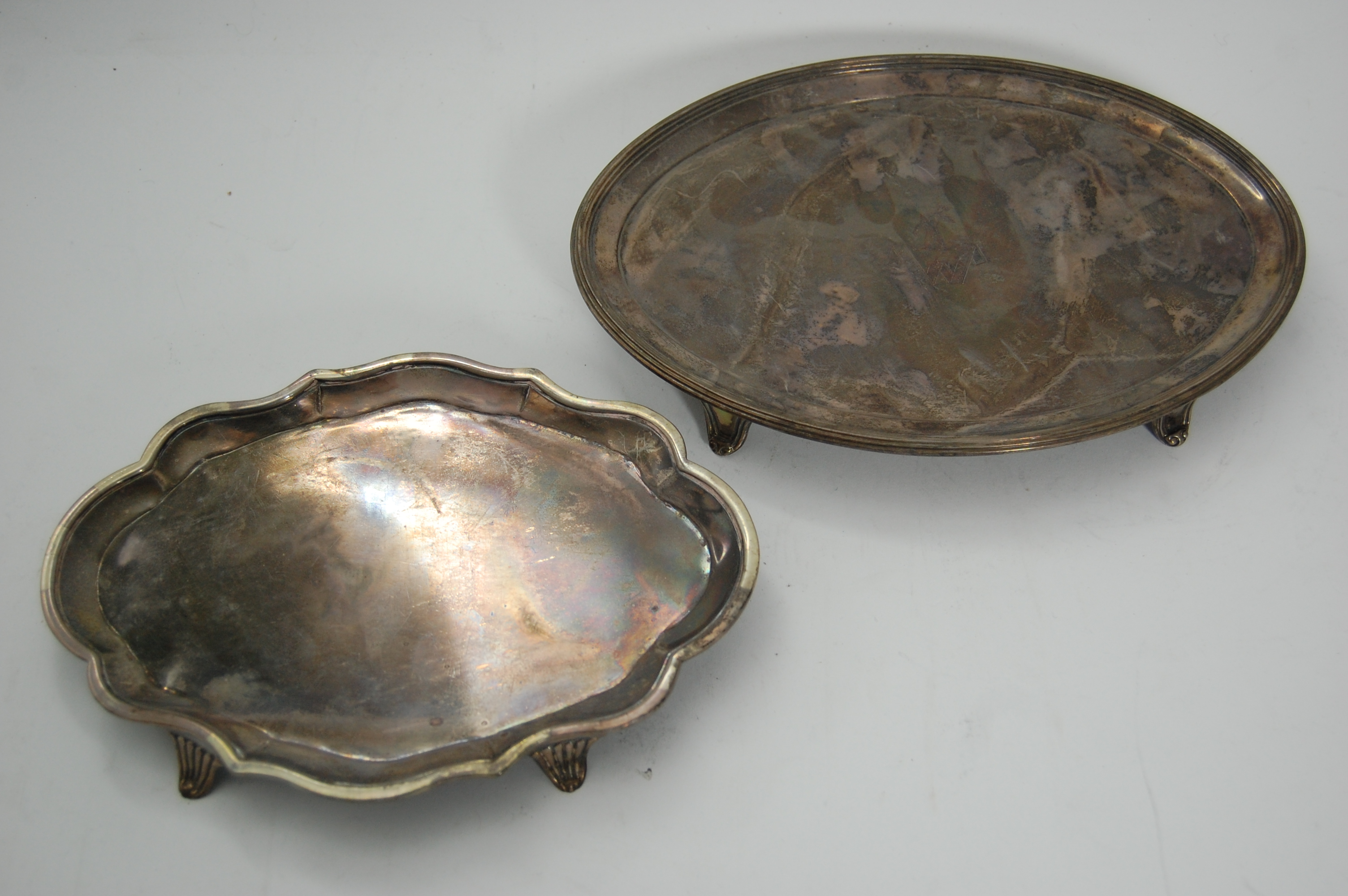 London 1813, of oval outline with reeded border and engraved crest, raised on four bracket feet; together with another example of shaped outline with reeded bracket feet (2)