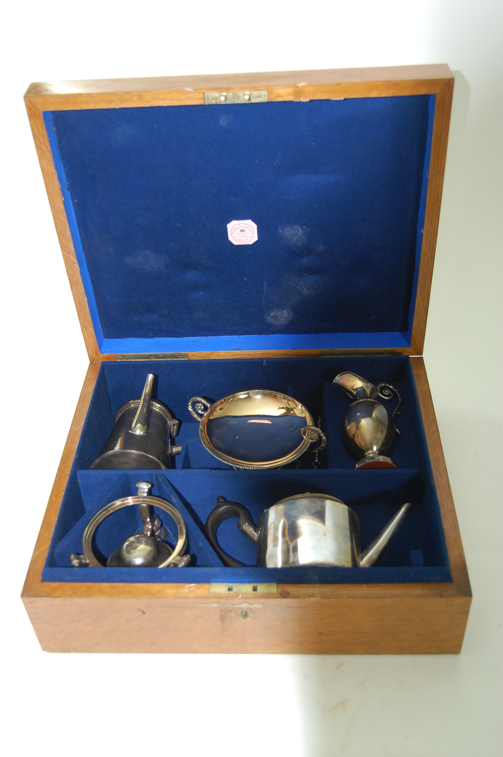 comprising spirit kettle on stand, kettle London circa 1760 (date letter lacking), stand Britannia standard, date letter obscured, burner London 1862; milk ewer, sugar bowl and tongs London 1857; teapot Continental white metal; all in simple style with beaded rims and in Victorian fitted wooden case