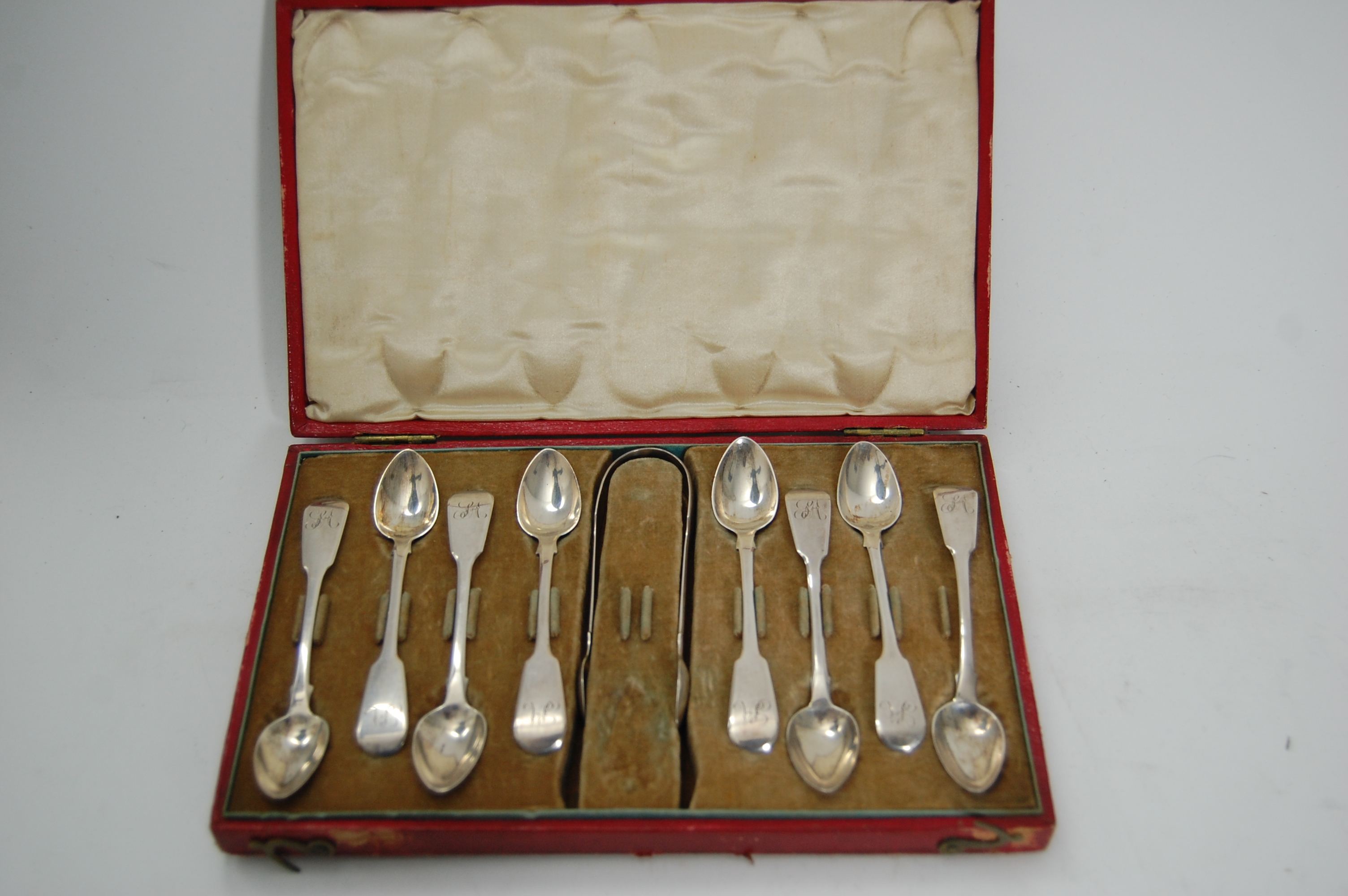 to include a group of scroll and fancy back teaspoons; a cased set of eight coffee spoon and sugar tongs, William Seaman, London 1822; various condiments spoons etc; also to include later flatware including a set of apostle top teaspoons cased; a similar set uncased and modern side knives and forks (qty)
