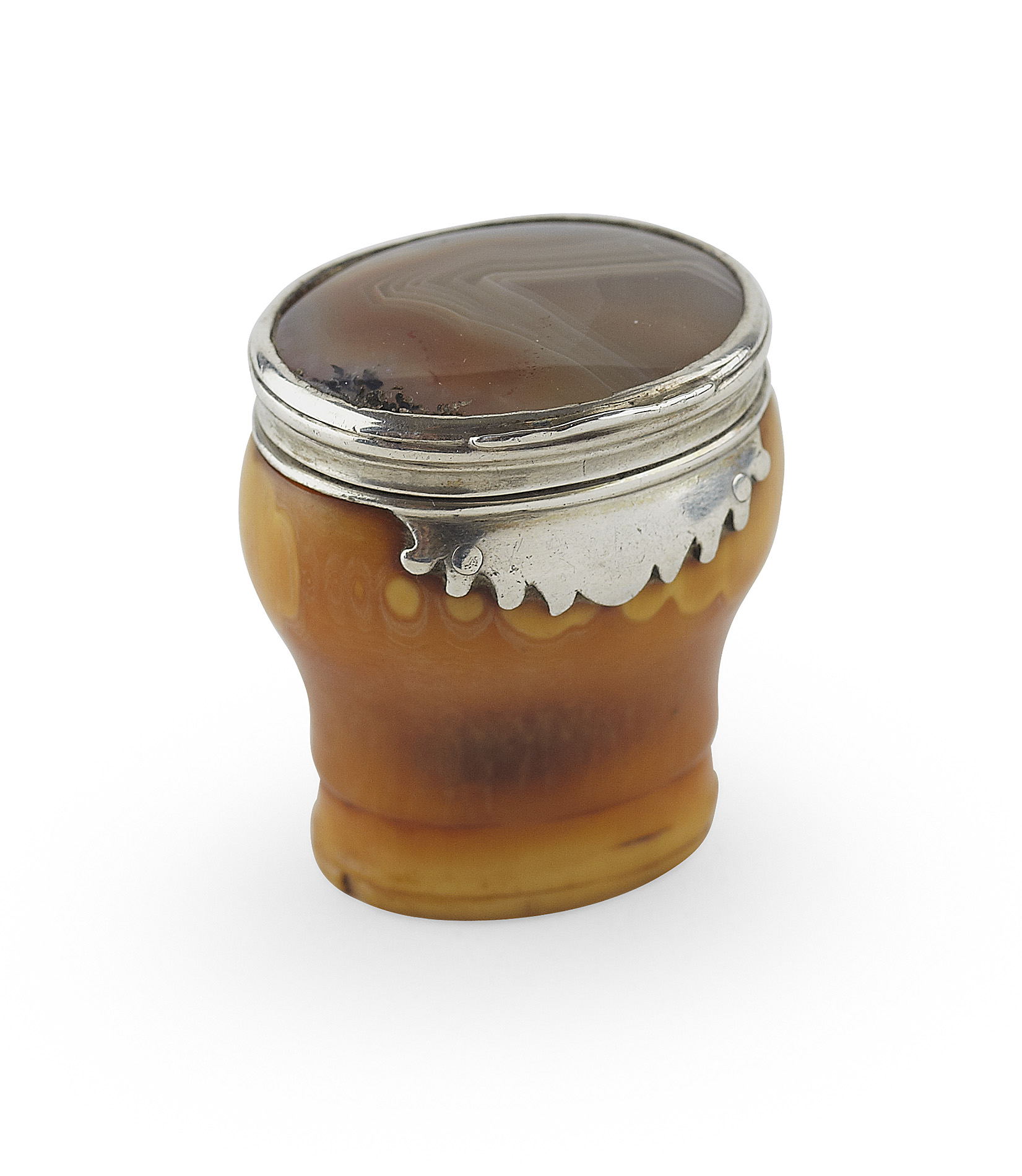mounts unmarked, the baluster body of conventional form with rib to lower section, with collar mount with scalloped thumbpiece and hinge, the hinged cover set with banded agate panel
