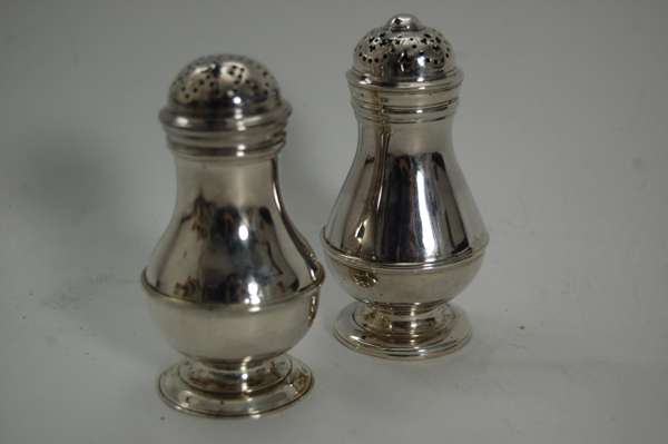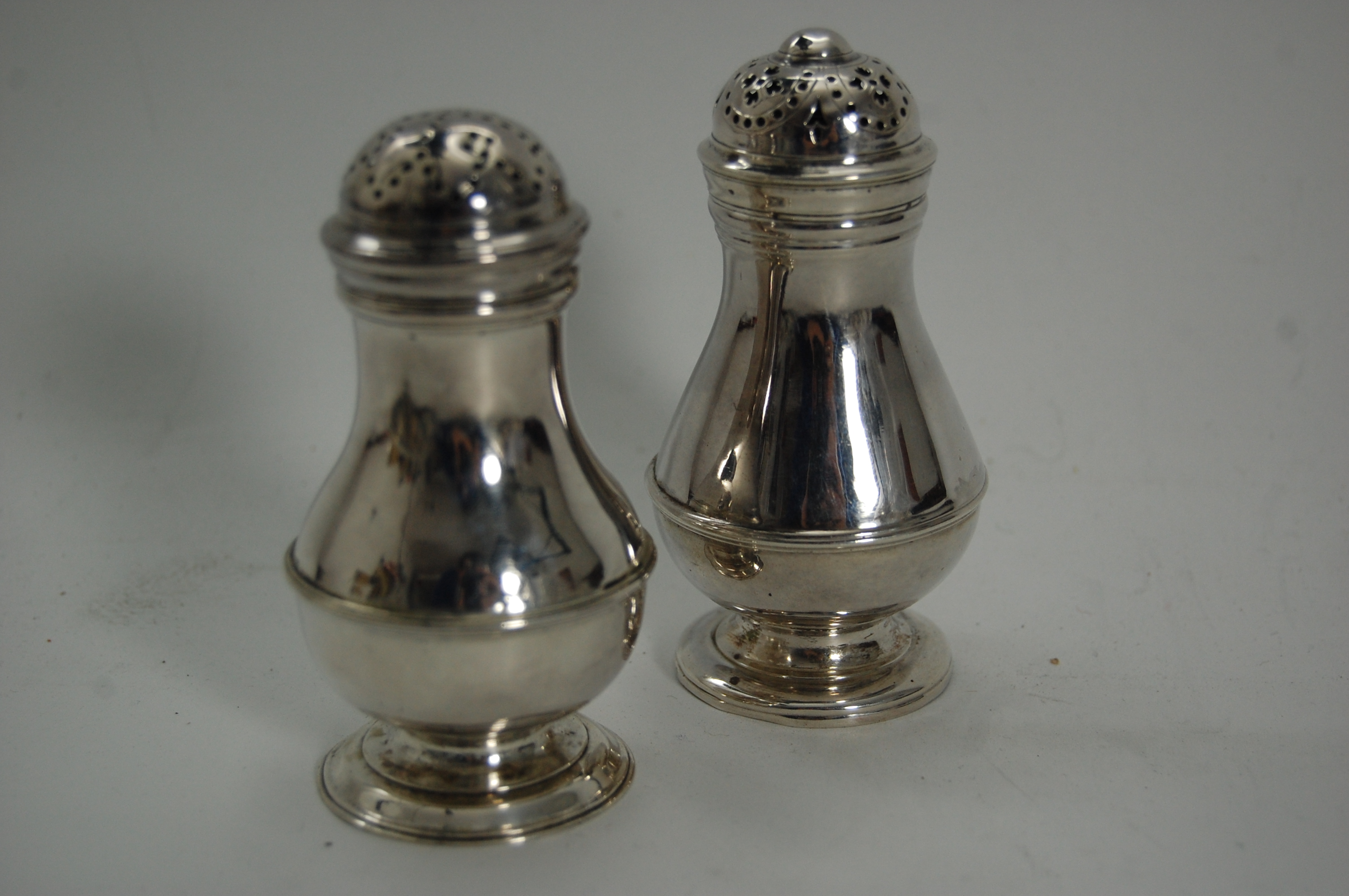 one John Vincent, London 1737, the other makers mark indistinct, London 1730, each of simple baluster from with domed pierced pull off covers and raised on simple spreading foot (2)