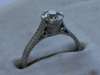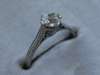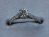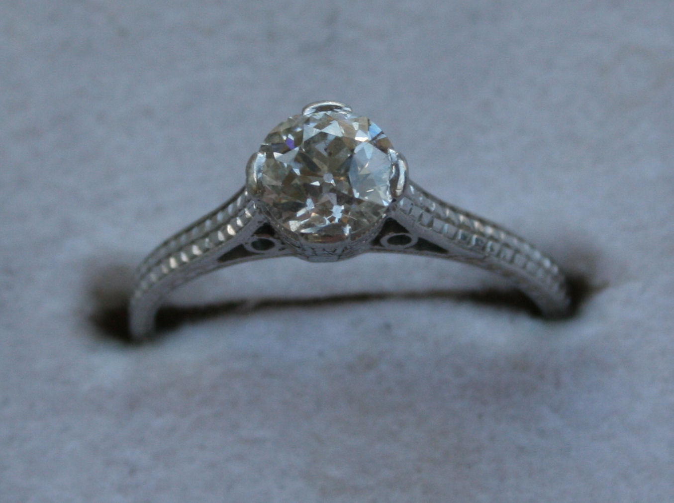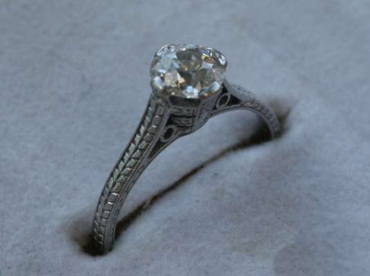 set in platinum and possibly French, the circular cut diamond claw set and with pierced gallery the shank with delicately engraved stylised leaf detail