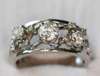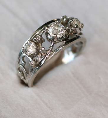 the modern design incorporating three graduated principal diamonds, each claw set and with six other smaller diamonds, the shank with S scroll pierced detail, marked 14K