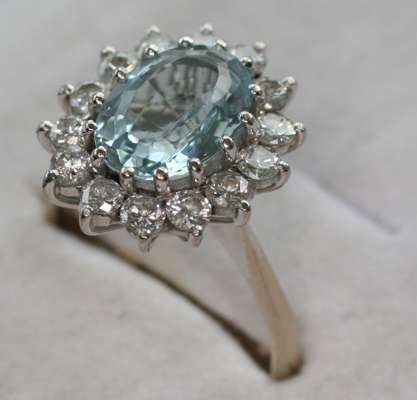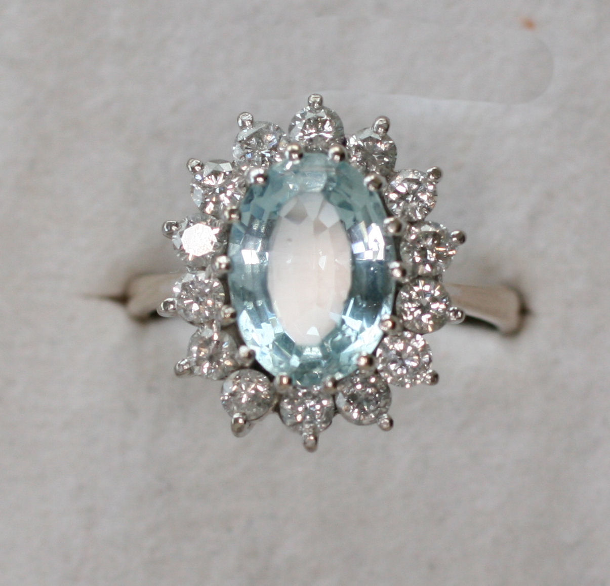 the oval claw set aquamarine within a border of fourteen circular brilliant cut diamonds, all set in 18ct white gold