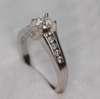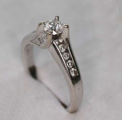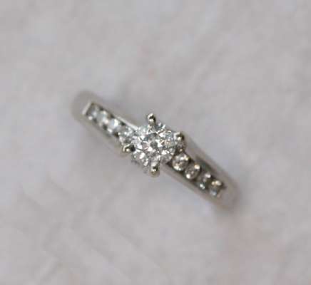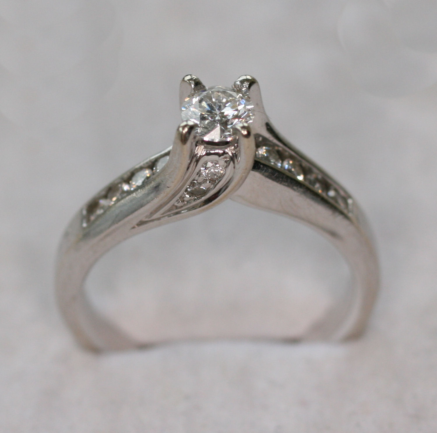 the central circular brilliant cut diamond, four claw set in scrolling diamond set shoulders, all in 18ct white gold