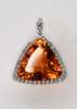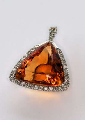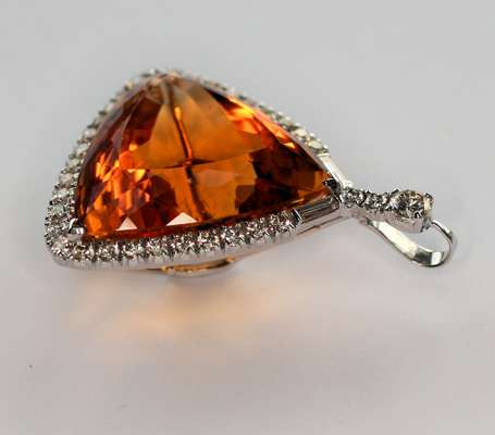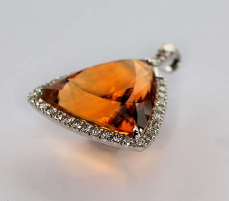 the rounded triangular citrine of a pleasing deep orange colour, corner claw set and within a conforming white metal border set circular cut diamonds with baguette cut diamond terminal at the diamond set bale
