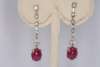 the oval cabochon ruby claw set and suspended from an alternating circular and baguette cut diamond line, post and butterfly setting