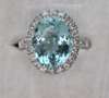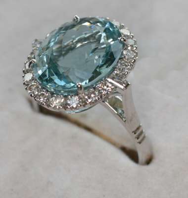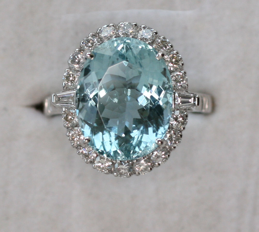 the oval aquamarine claw set on of a good colour, within a diamond set border, baguette set shoulder, set in 18ct white gold
