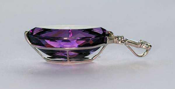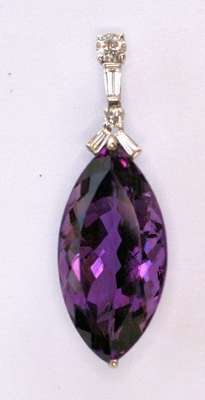 the navette shaped deep coloured amethyst, terminal claw set with a diamond set terminal and diamond set bale