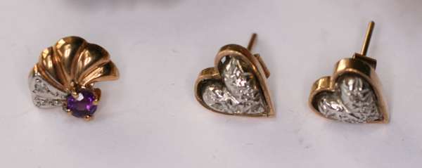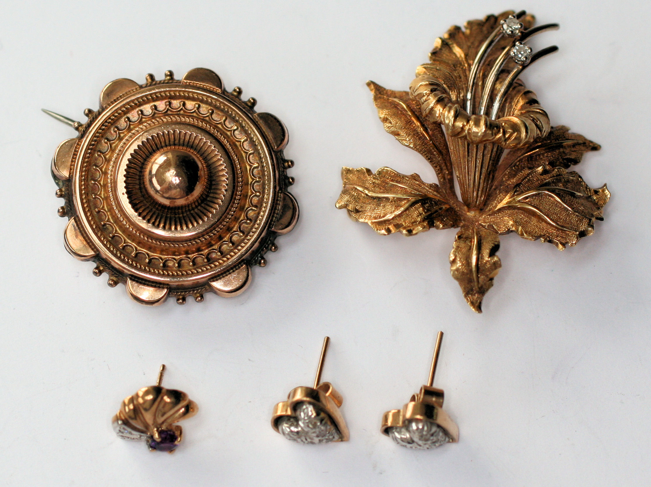 set two small diamonds; together with a Victorian gold brooch and ear studs set diamonds