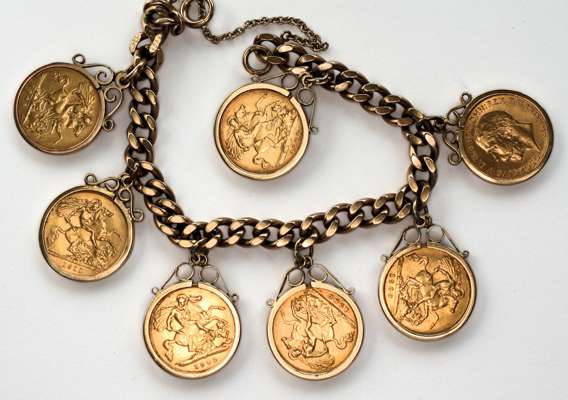 with seven half sovereigns in loose mounts; 1905, 1911, 1902, 1900, 1908, 1911, 1900 M