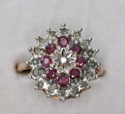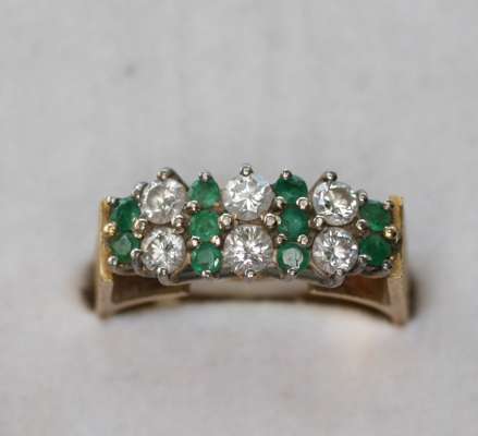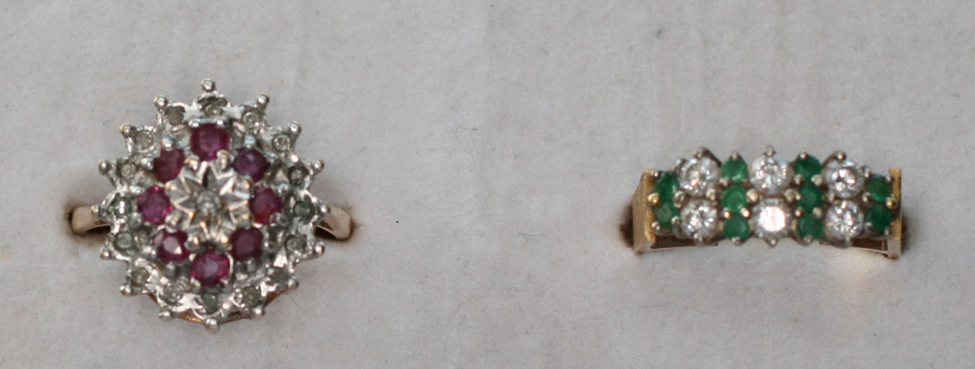 of stepped circular form together with a diamond and emerald cluster ring, of alternating pairs of emeralds and diamonds, all set in 18ct gold (2)