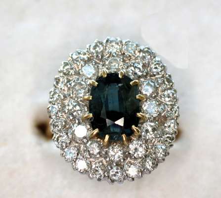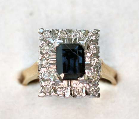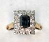 of stepped oval shape with a central claw set oval cut sapphire, together with another cluster ring, set rectangular cut sapphire and illusion set border of diamonds, both set in 18ct gold (2)
