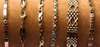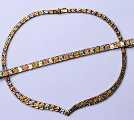 yellow and rose gold, polished and satin finishes, with a three coloured silver necklace and matching bracelet